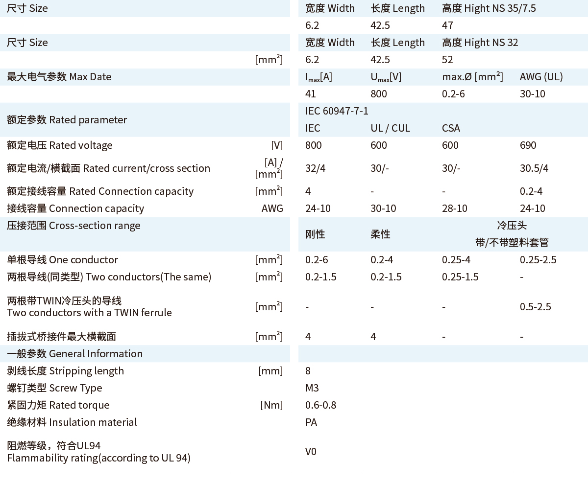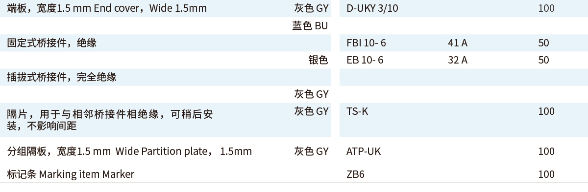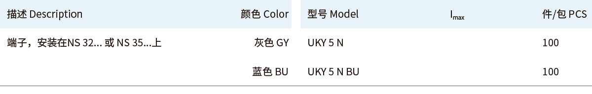 ■UKY通用组合式接线端子■直通式接线端子UKY■4 (6) mm²,41 A,直通式接线端子■UKY 系列通用连接端子能够满足实际应用所需的特征■通用安装脚,可用于DIN导轨NS 35...和 NS 32... 上■通过端子中央或插拔式桥接件进行等电位分配■满足大电流的桥接功能