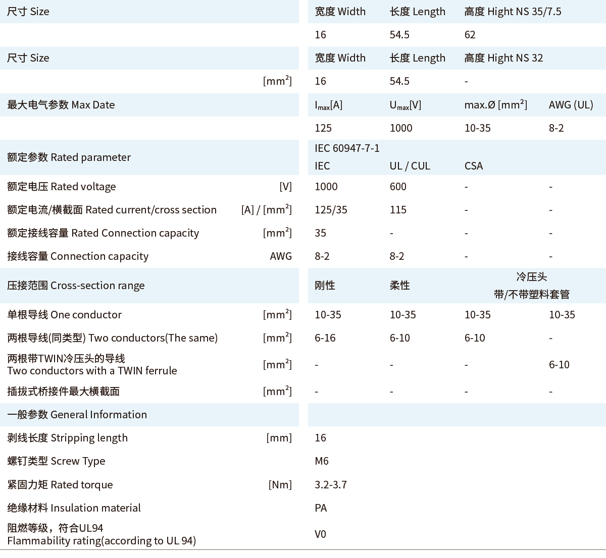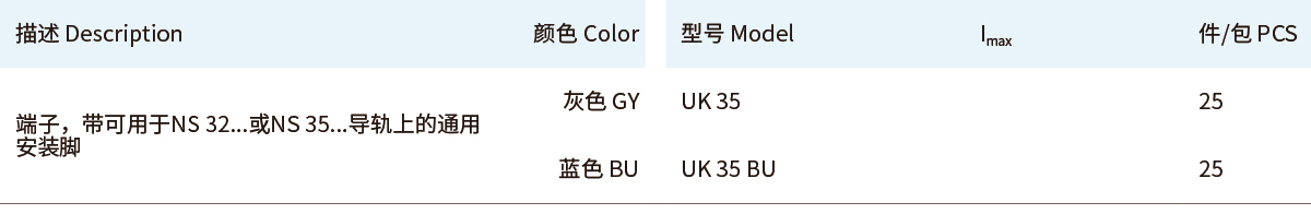 ■UKY通用组合式接线端子■直通式接线端子UKY■35 (35) mm²,125A,直通式接线端子■UKY 系列通用连接端子能够满足实际应用所需的特征■通用安装脚,可用于DIN导轨NS 35...和 NS 32... 上■通过端子中央或插拔式桥接件进行等电位分配■满足大电流的桥接功能
