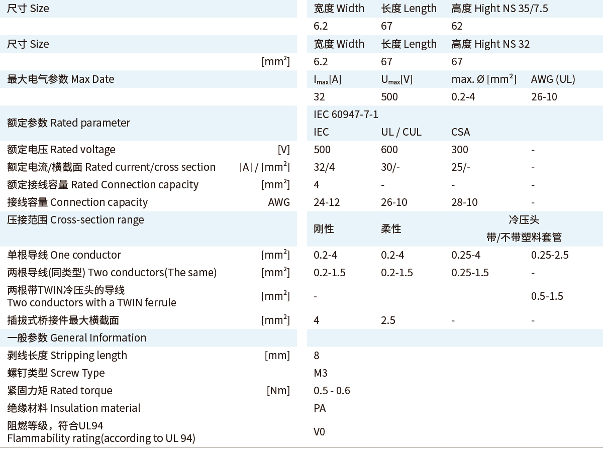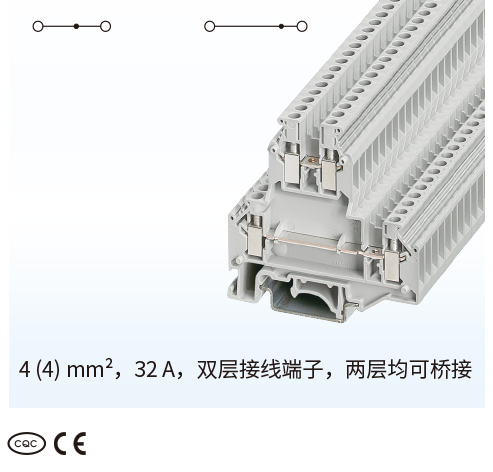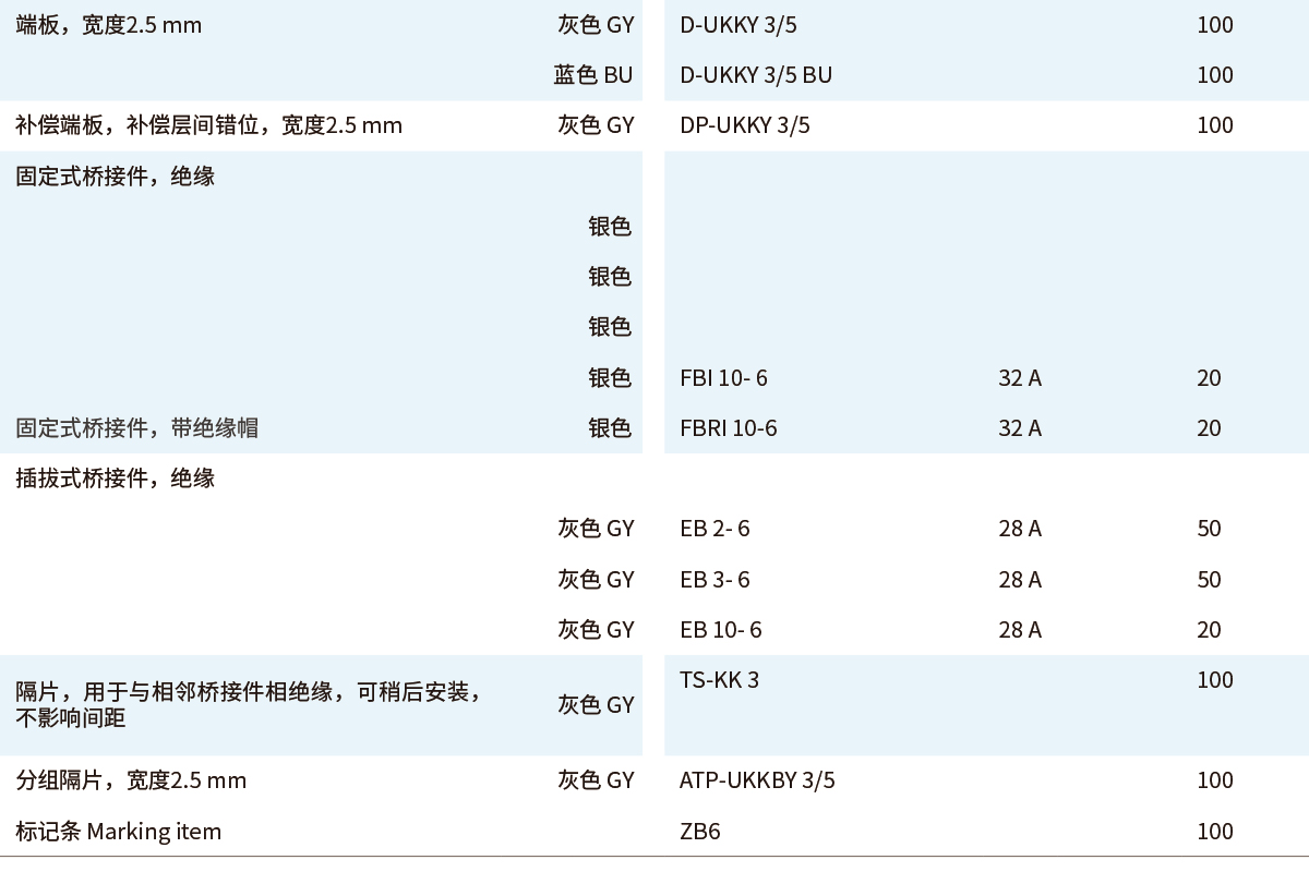 ■UKY通用组合式接线端子■双层接线端子 UKKBY■4 (4) mm²,32 A,双层接线端子,两层均可桥接■紧凑型双层接线端子,额定横截面为2.5 和 4 mm²■一个或两个桥接井■可选大面积标识■即使每个接线位都接好导线,也可以通过错位层在端子下层方便地接线