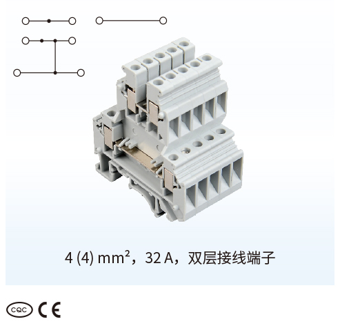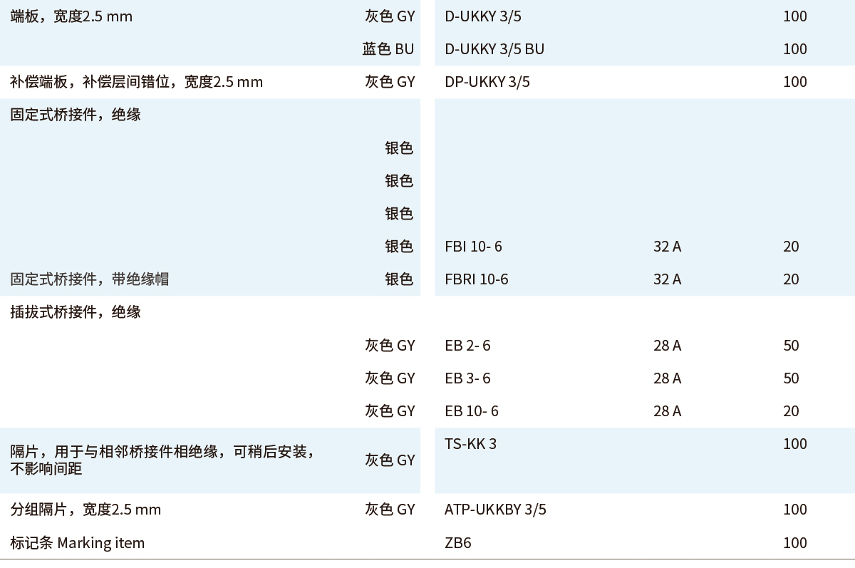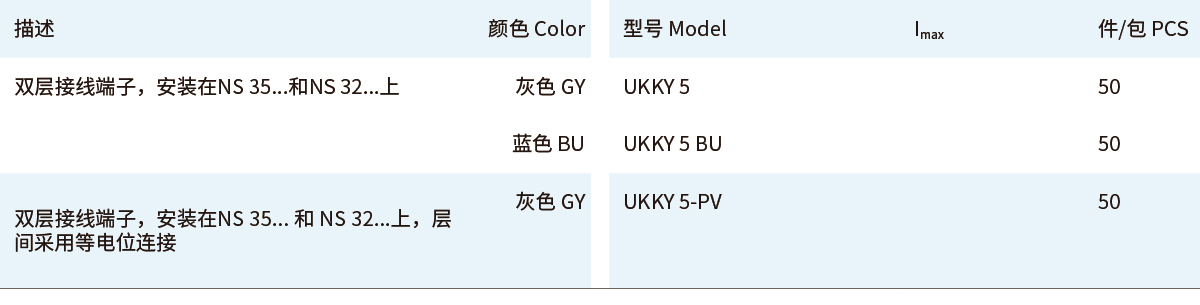■UKY通用组合式接线端子■双层接线端子 UKKBY■4 (4) mm²,32 A,双层接线端子■紧凑型双层接线端子,额定横截面为2.5 和 4 mm²■一个或两个桥接井■可选大面积标识■即使每个接线位都接好导线,也可以通过错位层在端子下层方便地接线