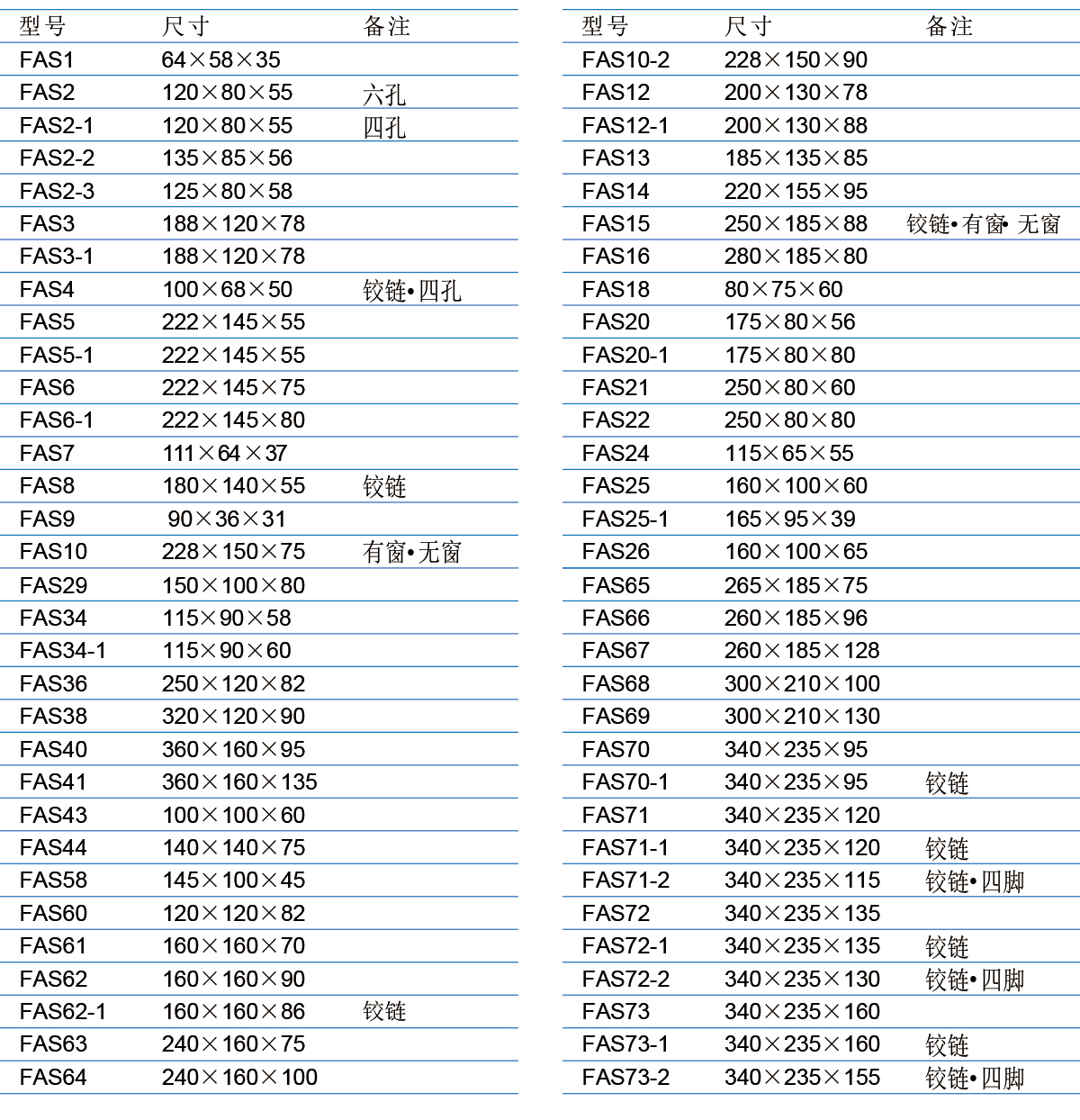 材质:铸铝合金防水等级:IP65颜色:青灰色●适合各种产业中间接线盒、端子盒、小型机电仪表器、通信接触盒等设备用。●压铸铝材质密封箱适合机械、船舶、汽车、生产流水线等各种设备石化产业与恶劣环境都可使用。●耐冲击性强、耐化学性高。用于矿产或化学等EX区域保护端子板和电子设备等增安型防爆电气密封箱