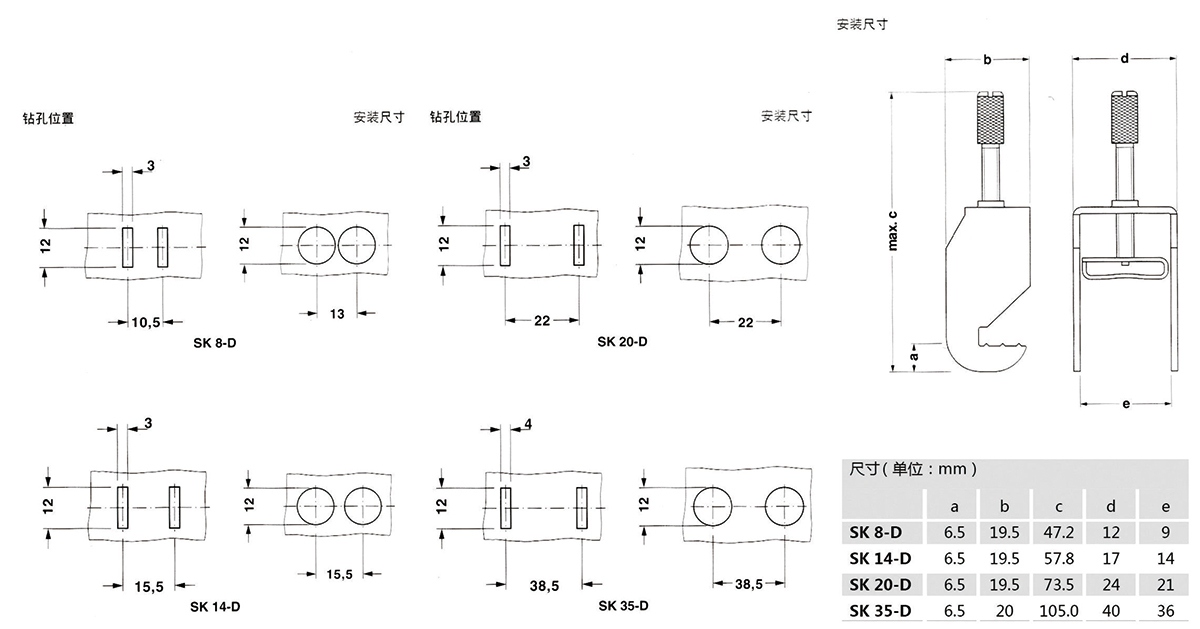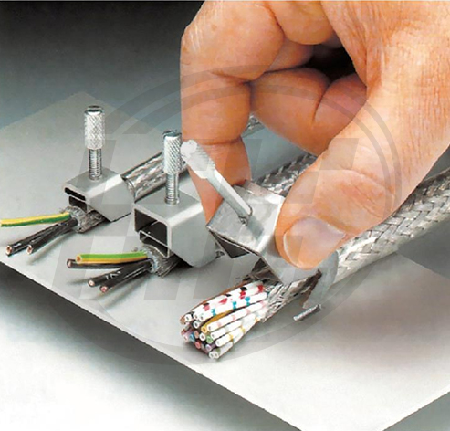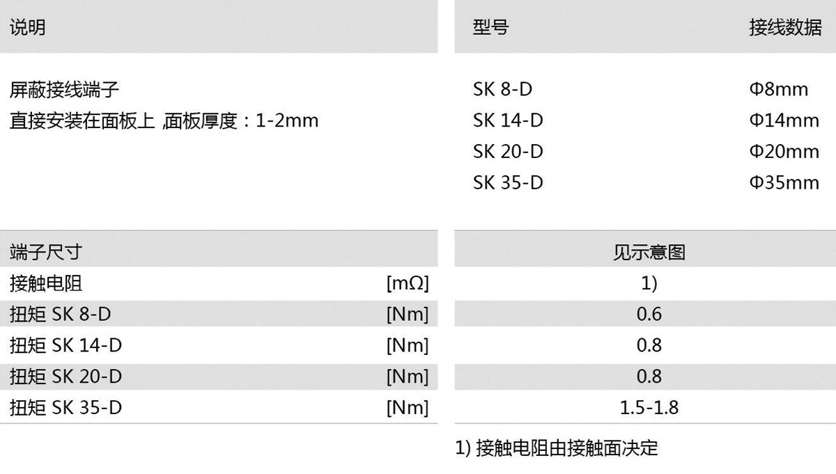 SK-D 的主要特点是可以直接安装在设备外壳或金属面板上 这就意味着不需要再安装支架或汇流条 ,便可通过设备外壳或金属面板泄放干扰信号。 SK-D 的安装非常方便,只需要简单地将其钩在预留的冲孔中就可以了。 注意:屏蔽接线端子不可用作导线抗拉扯装置,