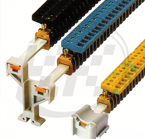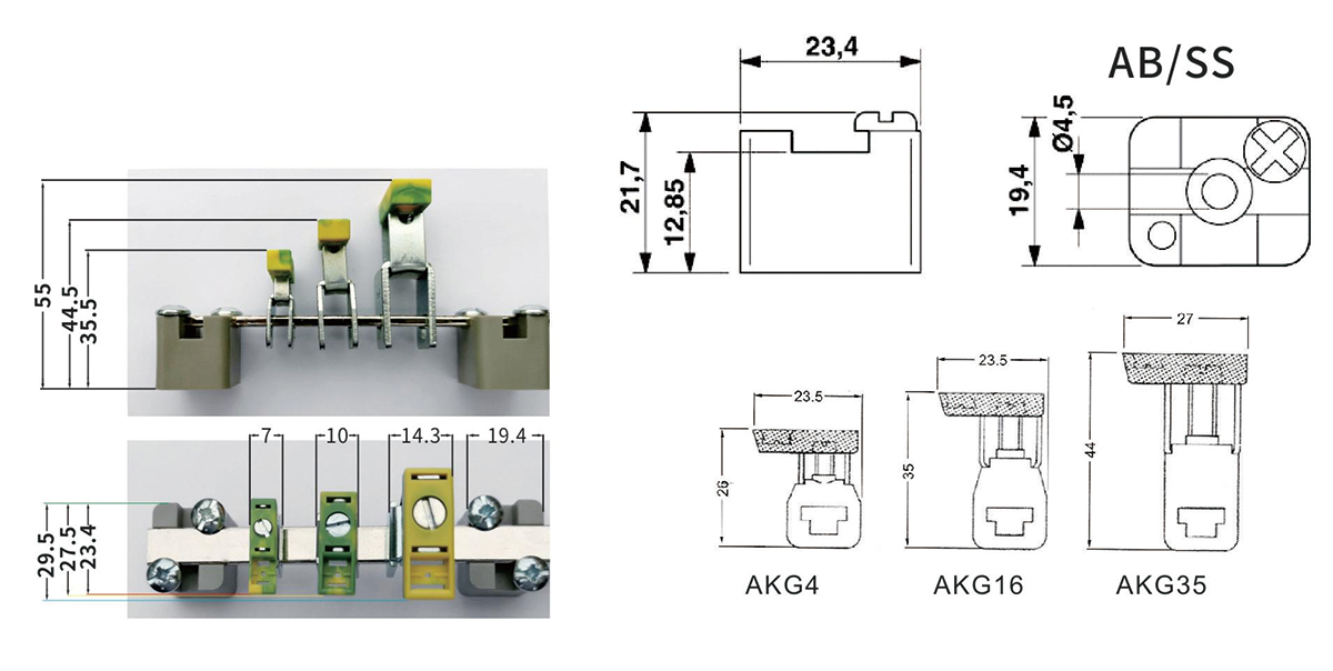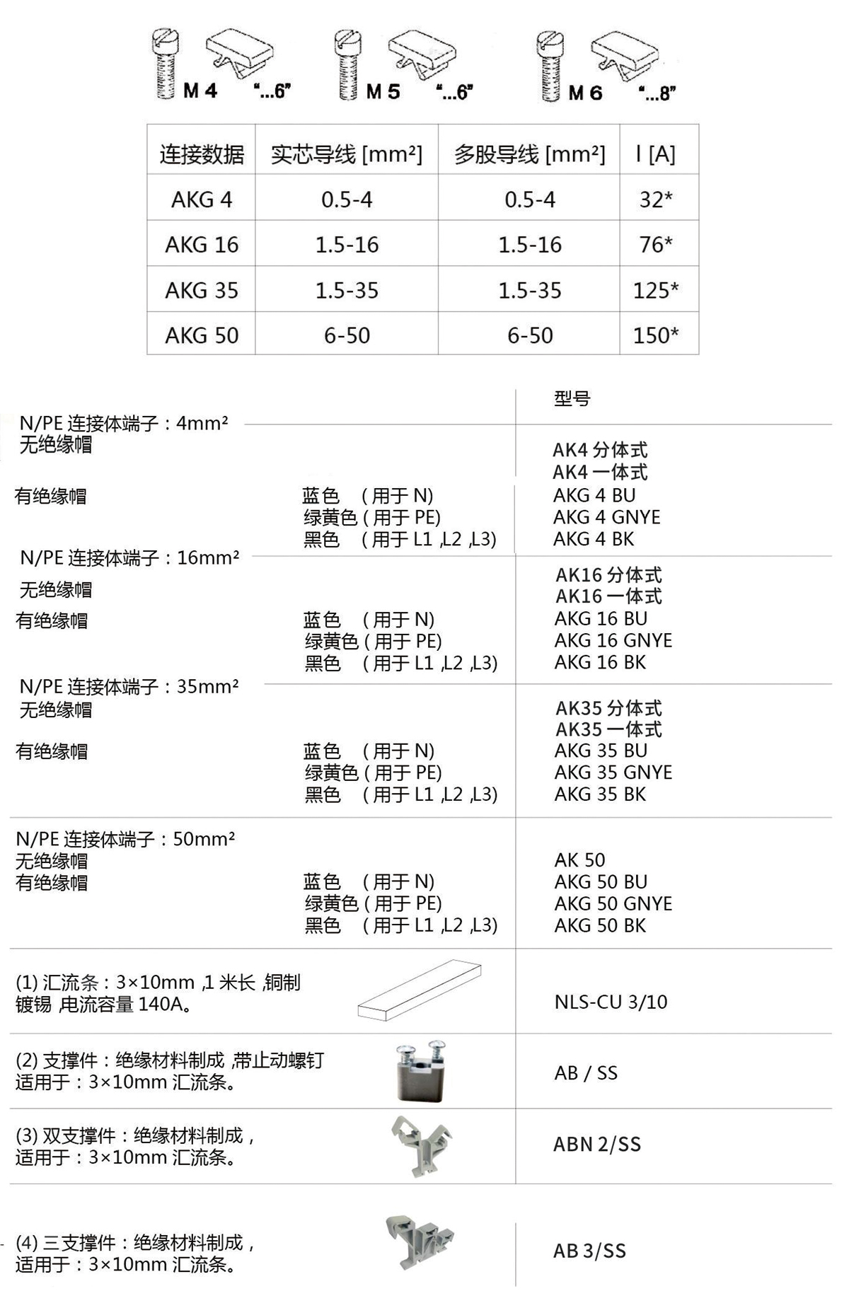 ●AK 和 AKG 连接体端子设计成固定通道安装的端子。它们装存 3x10mm 的汇流条上。●其优点有:一能固定在两种形状的导轨上。一由于是穿入导轨,端子压块工作绝对可靠。一螺栓不松动。二种由绝缘材料制成的支撑件可供●选择:1、单支撑 AB/SS( 带螺钉)用于汇流条2、用于 N 线和 PE 线汇流条的两侧错位排列的双垫块 ABN 2/SS。●绝缘外壳型号:●颜色:灰色。●额定横截面是指未经任何处理并不带冷压端头的连接导线横截面。