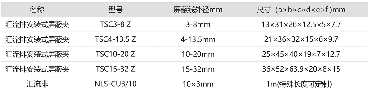 ●TSC-Z新款屏蔽夹●用于10x3mm的汇流条上●可用扎带固定,抗轻微拉扯●新的TSC-Z屏蔽夹是基于TSC屏蔽夹增加了一个应力释放支架,抗轻微拉扯,以防止损坏屏蔽电缆。●TSC-Z屏蔽夹有多种安装方式:①直接安装在10x3mm的汇流条上;②通过螺丝固定在安装板上;③通过TSC-CPB安装脚固定在C型导轨上;④用TSC-RL安装脚固定在DIN35mmU型导轨上。