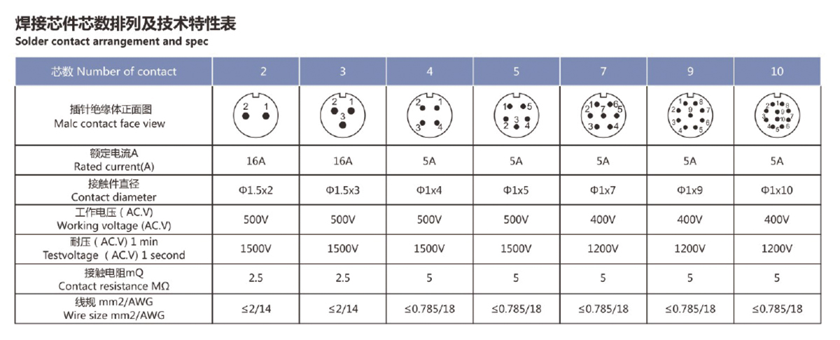 焊接芯件芯数排列及技术特性