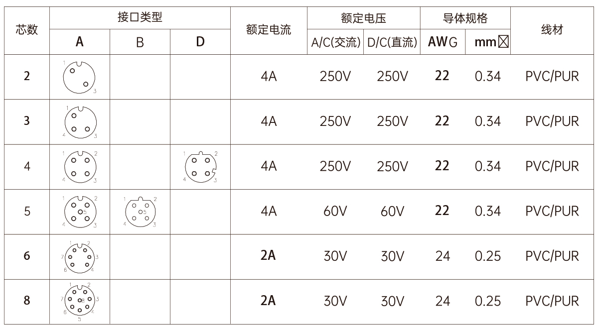 ●壳体材料: 黄铜/锌合金镀镍/PA+GF●胶芯材料:PA+GF/TPU●成型材料:TPU/PVC●端子材料:黄铜/磷铜镀金●适用温度:-40°C~+80°C●绝缘阻抗:>100mΩ(兆欧)●接触阻抗:<5mΩ(毫欧)●防护等级:IP67●插拔次数:>500次●接线范围:Ø6mm~Ø8mm