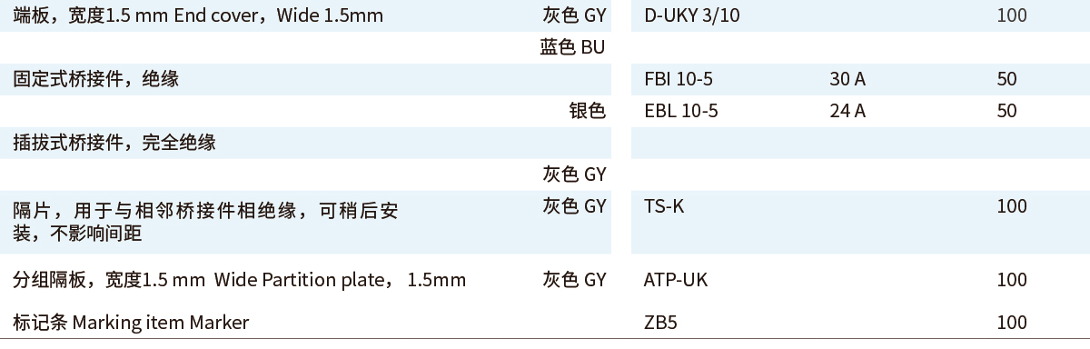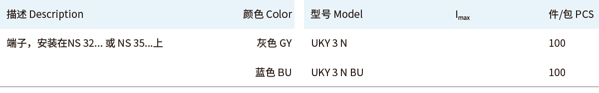 ■UKY通用组合式接线端子■直通式接线端子UKY■2.5 (4) mm²,32 A,直通式接线端子■UKY 系列通用连接端子能够满足实际应用所需的特征■通用安装脚,可用于DIN导轨NS 35...和 NS 32... 上■通过端子中央或插拔式桥接件进行等电位分配■满足大电流的桥接功能